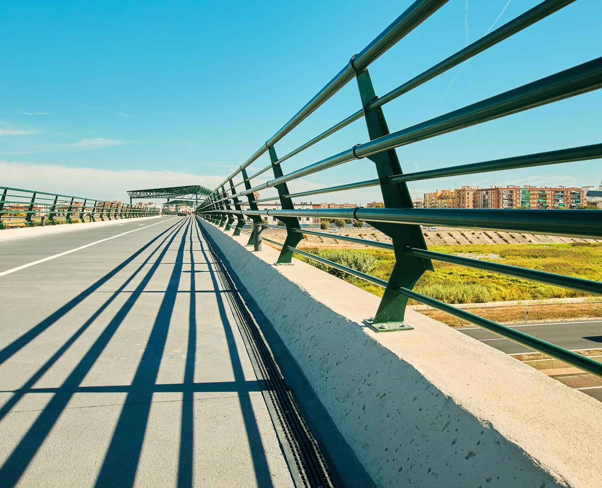 - Barandillas urbanas y de viaductos:Son elementos críticos en puentes peatonales, paseos marítimos o desniveles urbanos. Deben combinar una resistencia mecánica extrema con tratamientos anticorrosión de alta durabilidad (como el galvanizado en caliente según ISO 1461), ya que suelen estar expuestos a ambientes agresivos. Su función es doble: evitar la caída accidental del peatón y, en muchos casos, contener el impacto de ciclistas o vehículos de movilidad personal (VMP).