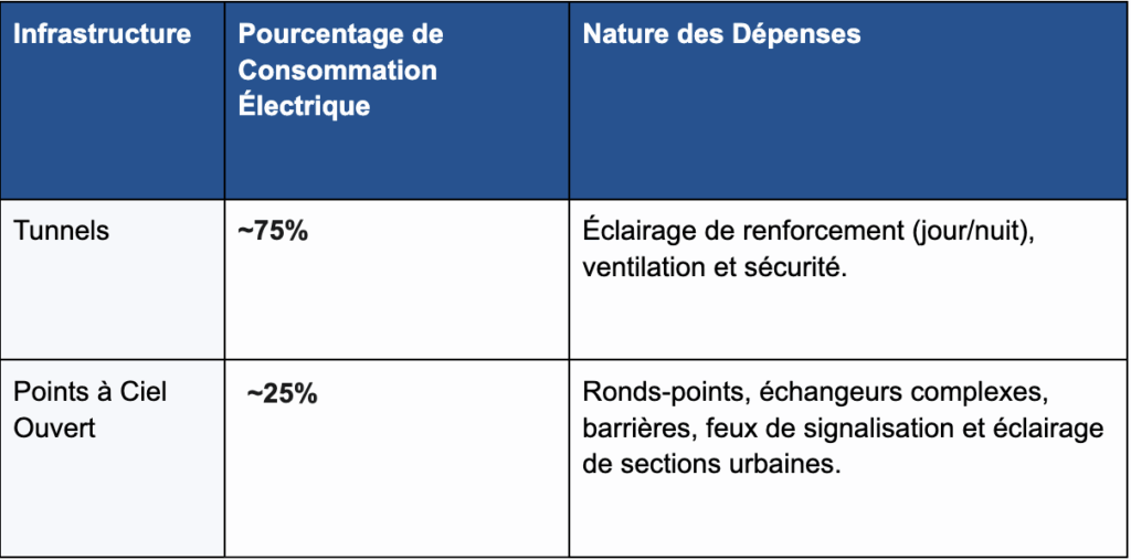 L’infrastructure interurbaine présente une distribution de consommation déséquilibrée, se concentrant principalement sur l’éclairage et l’opérationnalité des structures fermées.