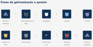 - Acabamento e Envio: Remoção do excesso de zinco, inspeção final da espessura de acordo com as normas e preparação para o envio.